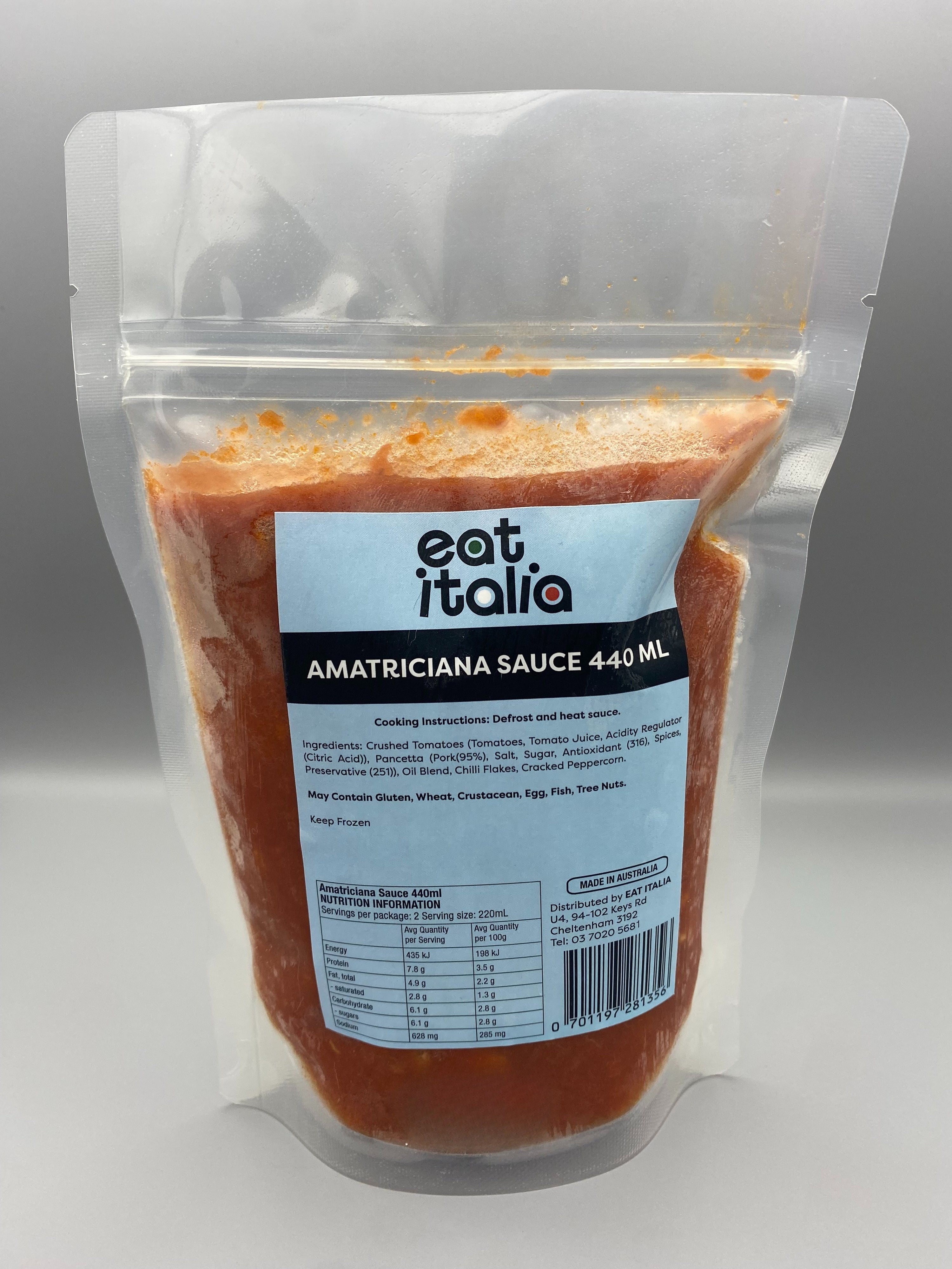 Ingredients: Crushed Tomatoes (Tomatoes, Tomato Juice, Acidity Regulator (Citric Acid)), Pancetta (Pork(95%), Salt, Sugar, Antioxidant (316), Spices, Preservative (251)), Oil Blend, Chilli Flakes, Cracked Peppercorn.